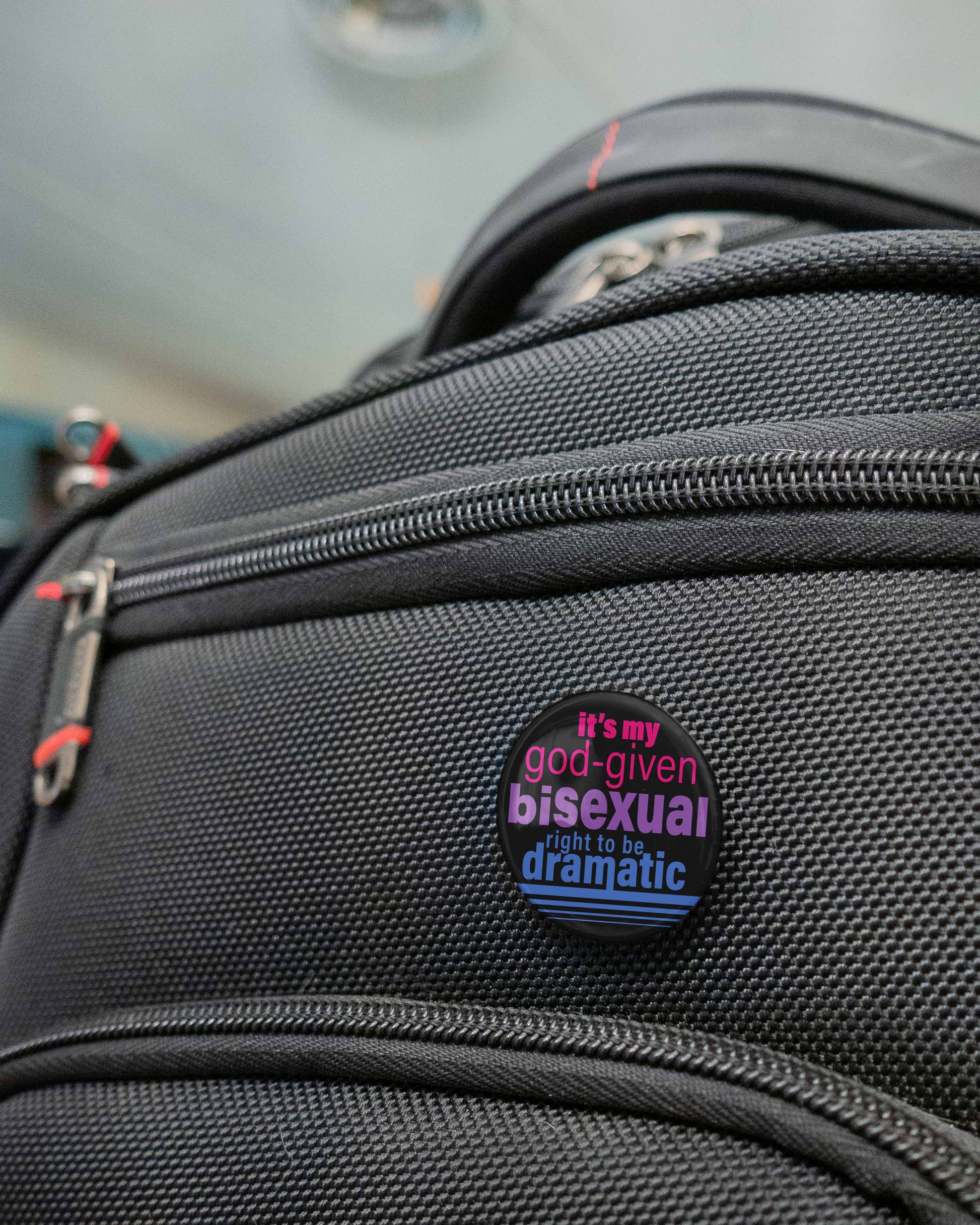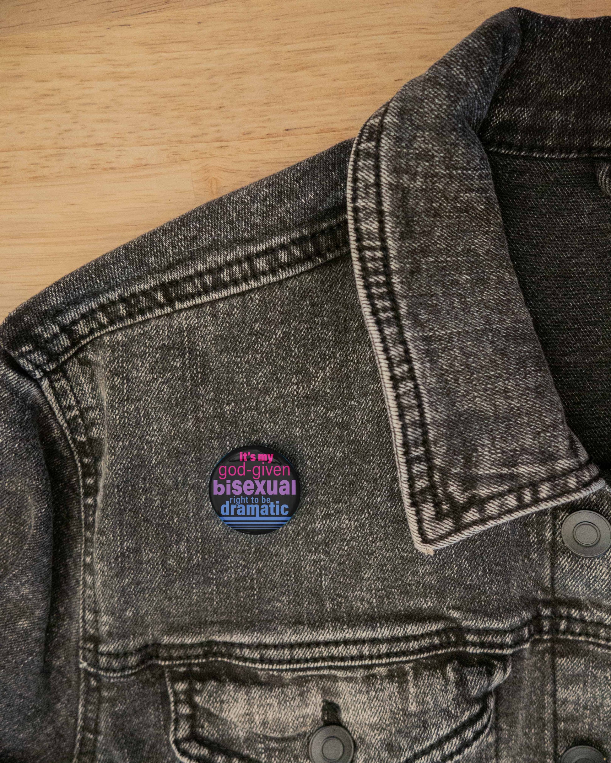 Sometimes your friends say something so great that you just have to make it into a pin (and later keychains, magnets and stickers). This one came from my friend Karter while we were heading to my local pride fest and reads “It’s my god given bisexual right to be dramatic”